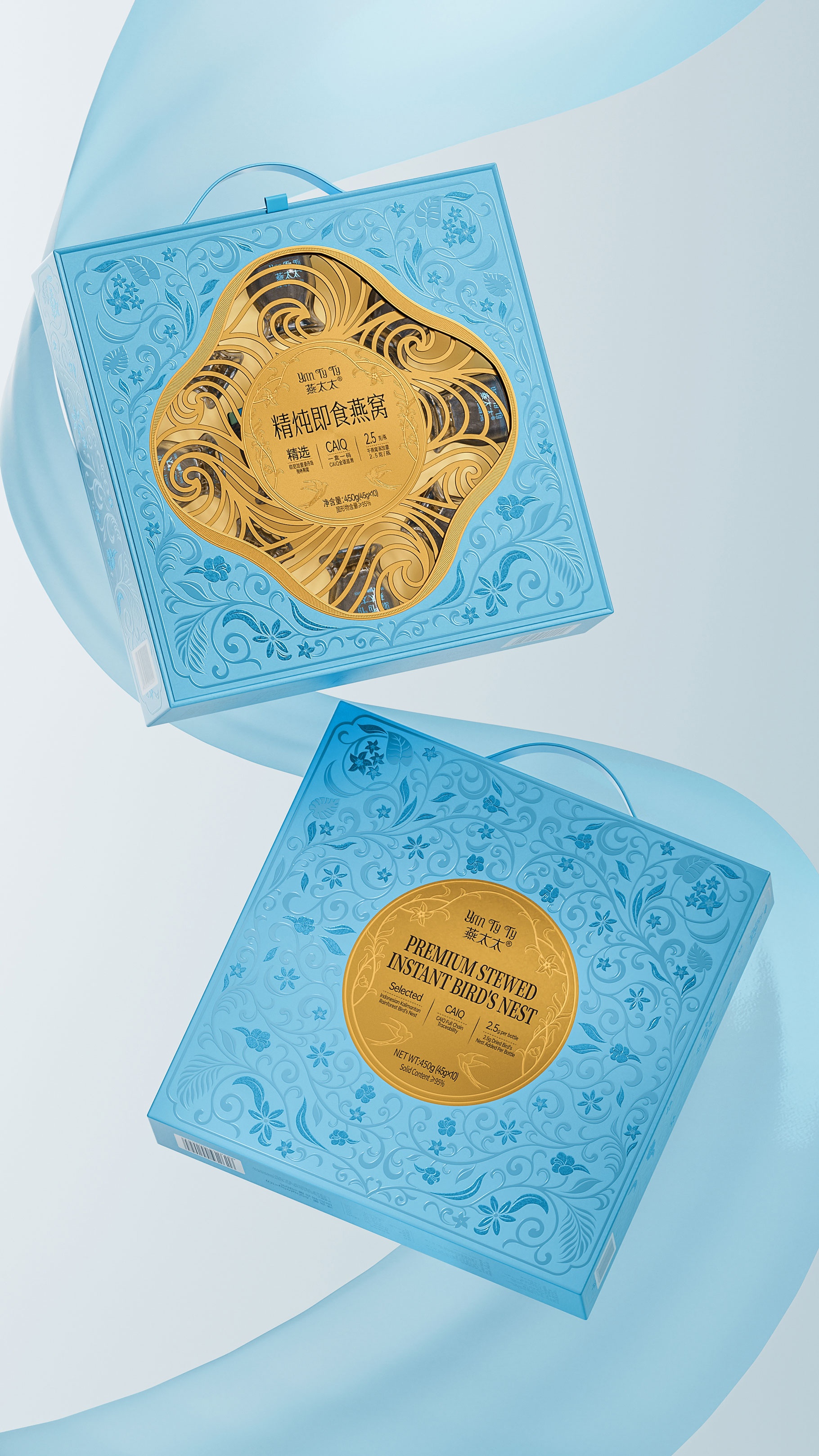 整體包裝創(chuàng)意以獨創(chuàng)三層視覺敘事:中部采用東方園林“框景”手法打造鏤空視窗,湖藍(lán)色藤蔓紋樣層疊延展,再現(xiàn)雨林生態(tài)的呼吸韻律,虛實交錯間透現(xiàn)燕窩瑩潤質(zhì)感。