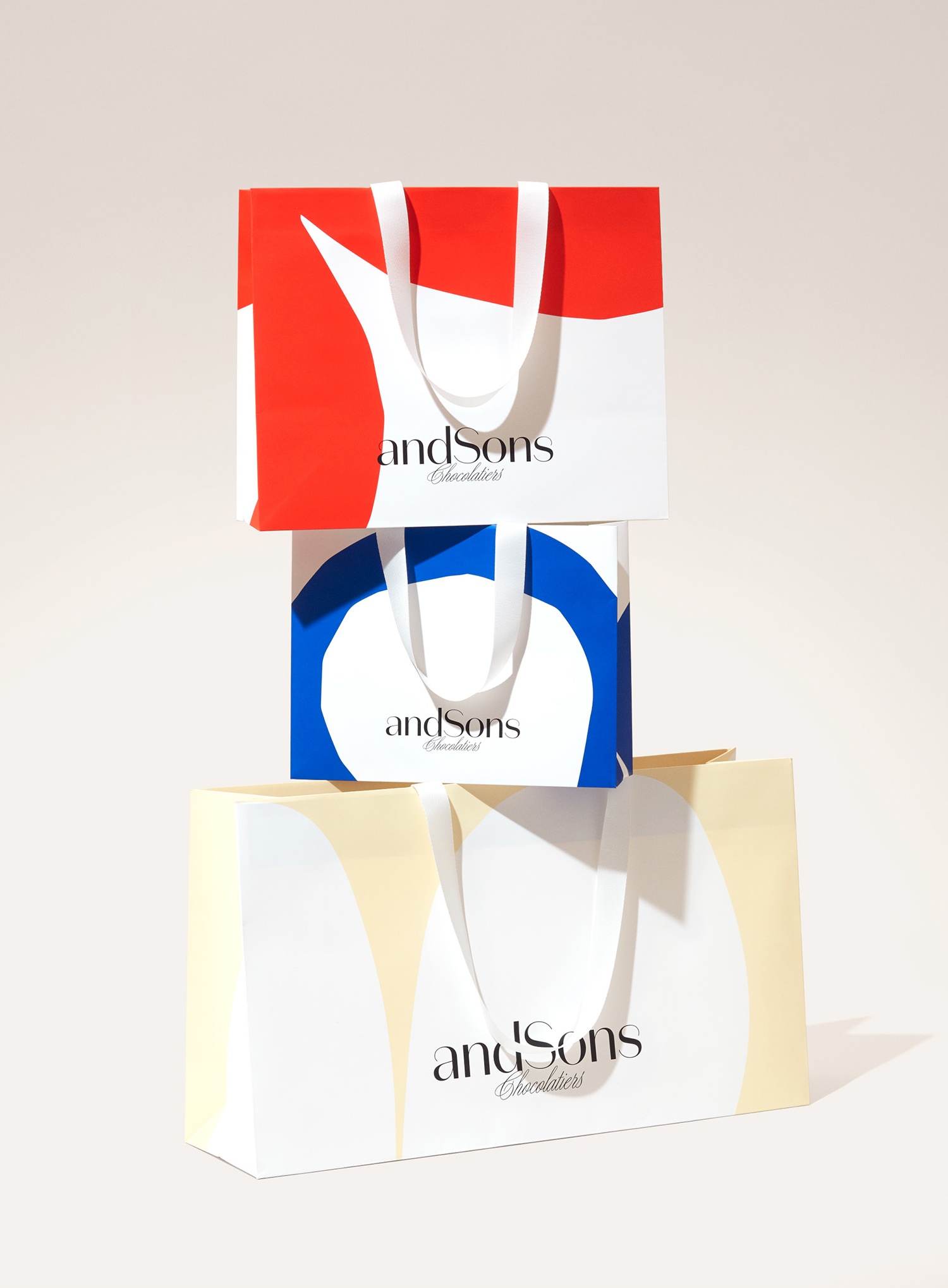 andSons是第二代巧克力零售商,由馬克和菲爾·科維茲經營,這兩個兄弟從母親那里學到了一切有關精制巧克力的知識。十大糕點師克里斯·哈維與兄弟們一同前進,力求為手工巧克力世界提供新的東西,而桑斯則在他們傳統的歐洲傳統和他們所居住的洛杉磯的當代創造力之間建立了界限。考慮到這一定位,Sons委托包裝設公司創造標志性的圖形標識和包裝設計,以捕捉創新精神,這種創新精神源于精致而奢華的傳統,同時也充滿了娛樂性和令人驚訝。這些意圖交織在一起,并通過簡單但優雅的標志,大膽的彩色圖案和白色襯托以及可互換的袖子將其表達出來。